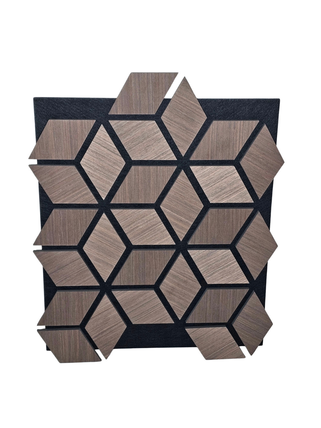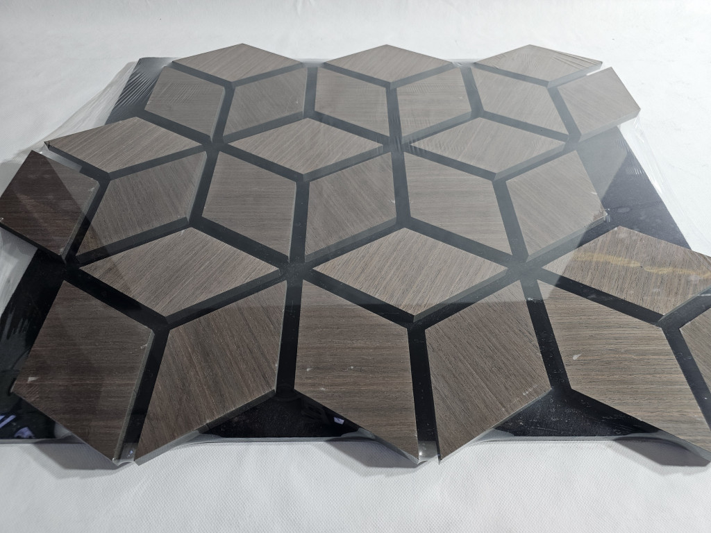 Anyag: MDF lamella valódi fa furnér bevonattal, poliészter (PET) akusztikai filc hátlappal