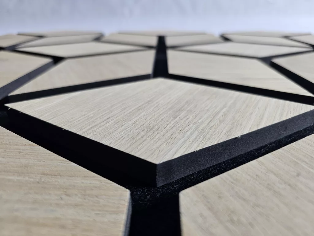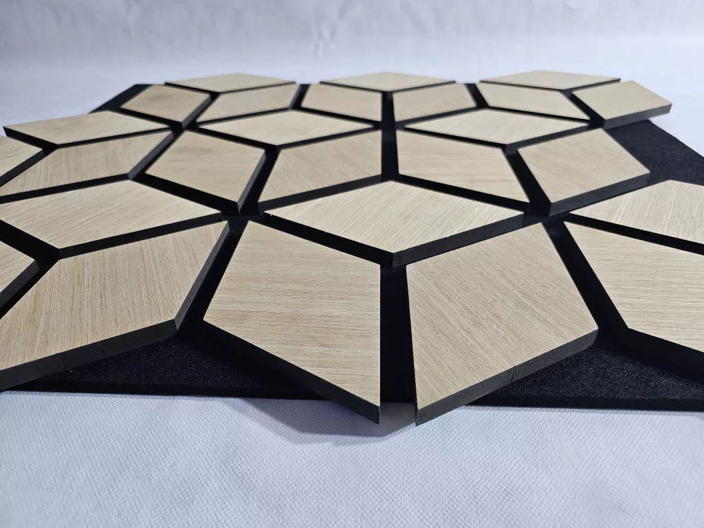 Anyag: MDF lamella valódi fa furnér bevonattal, poliészter (PET) akusztikai filc hátlappal