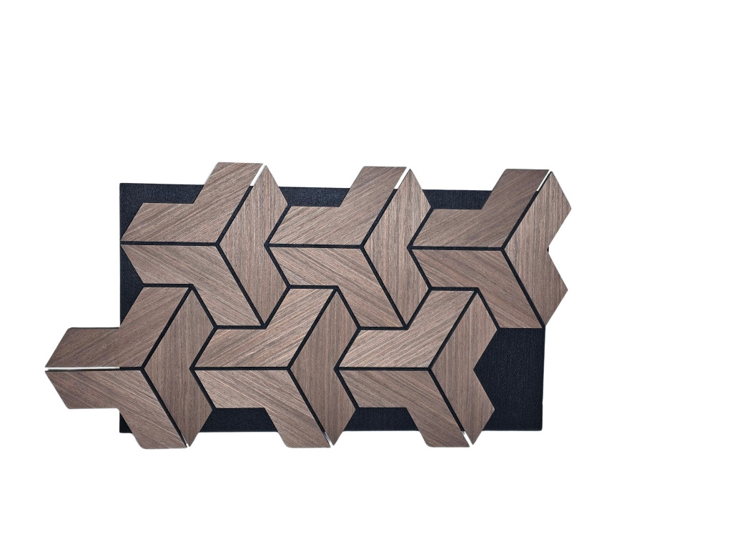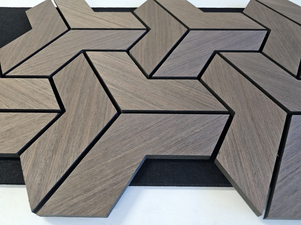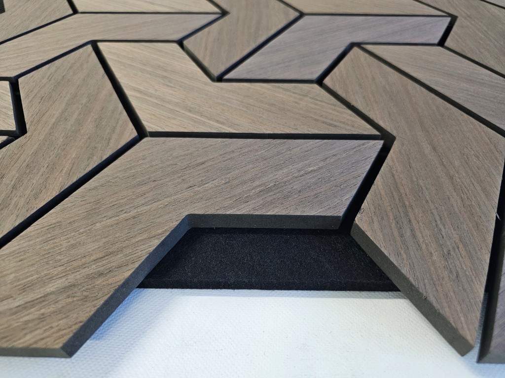 Anyag: MDF lamella valódi fa furnér bevonattal, poliészter (PET) akusztikai filc hátlappal