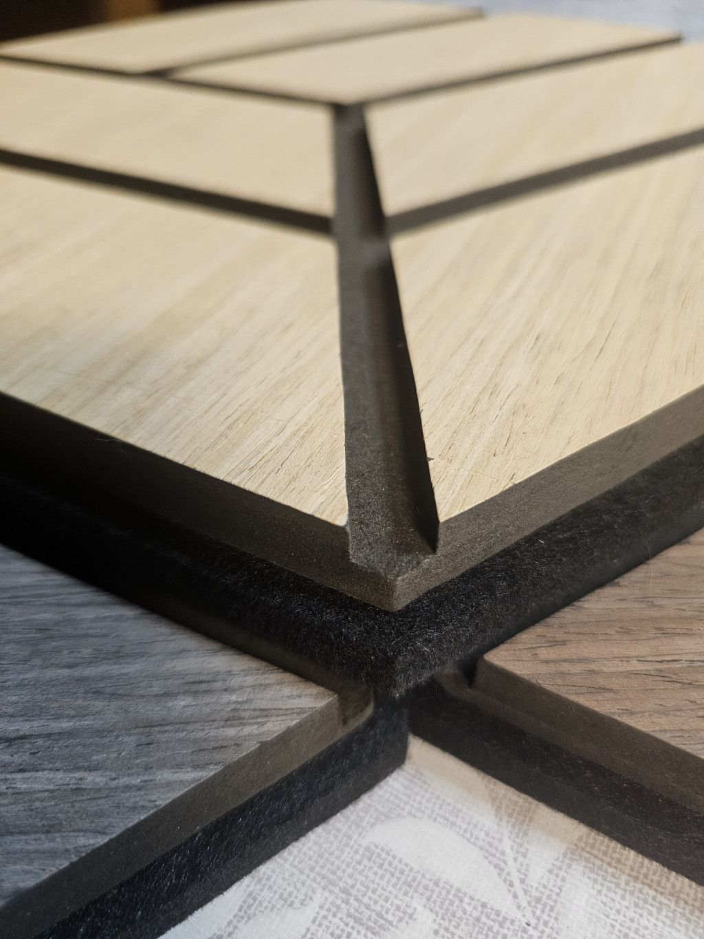 Anyag: MDF lamella valódi fa furnér bevonattal, poliészter (PET) akusztikai filc hátlappal