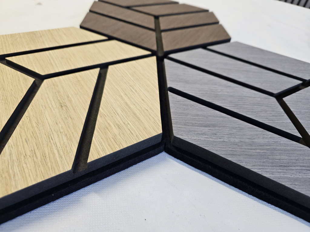 ECO HEXA design akusztikai falpanel modern belső terekhez. Hangelnyelő kialakítás, dekoratív megjelenés.