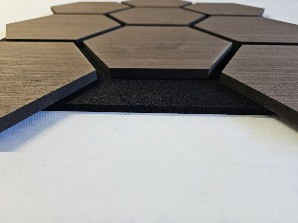 Anyag: MDF lamella valódi fa furnér bevonattal, poliészter (PET) akusztikai filc hátlappal