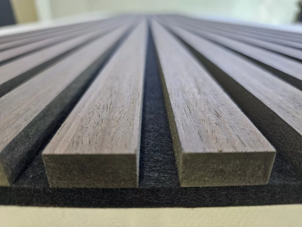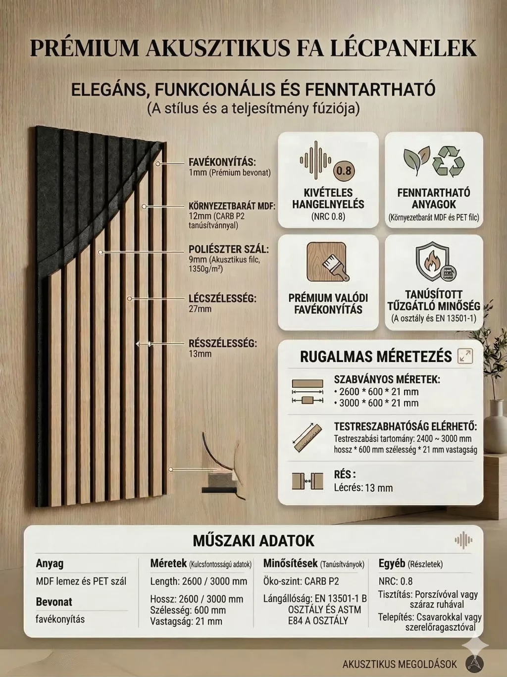 Anyag: MDF lamella valódi fa furnér bevonattal, poliészter (PET) akusztikai filc hátlappal