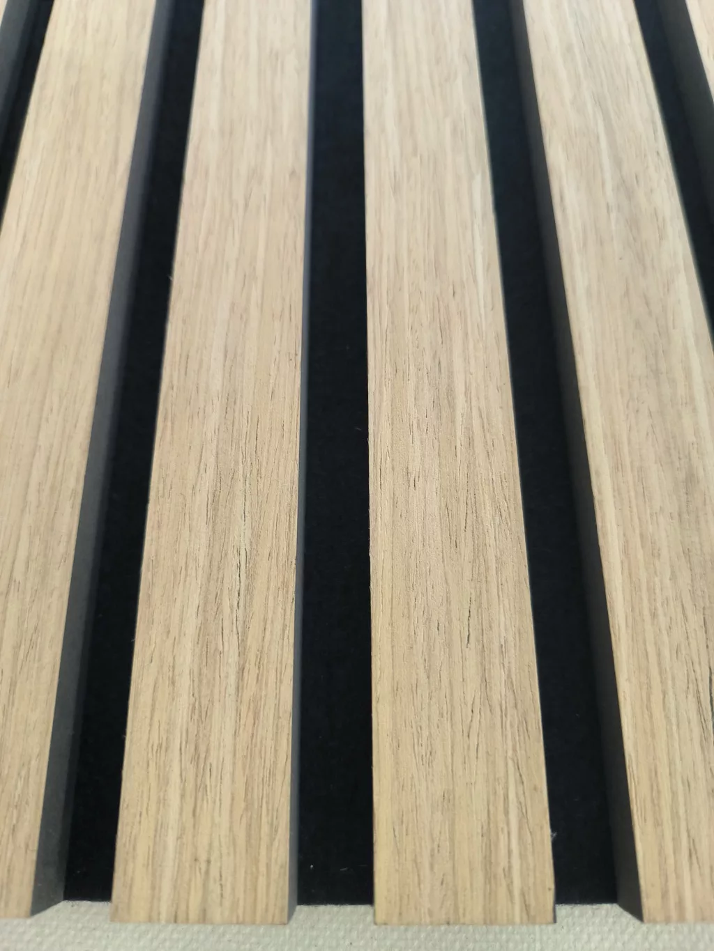 Anyag: MDF lamella valódi fa furnér bevonattal, poliészter (PET) akusztikai filc hátlappal