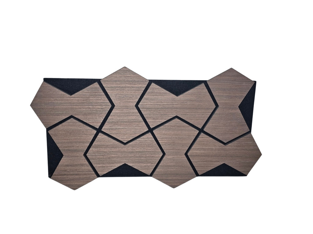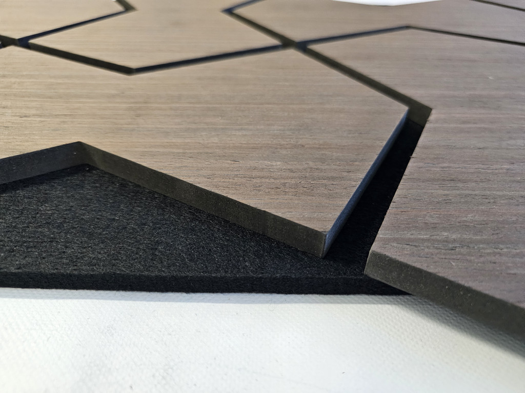 Anyag: MDF lamella valódi fa furnér bevonattal, poliészter (PET) akusztikai filc hátlappal