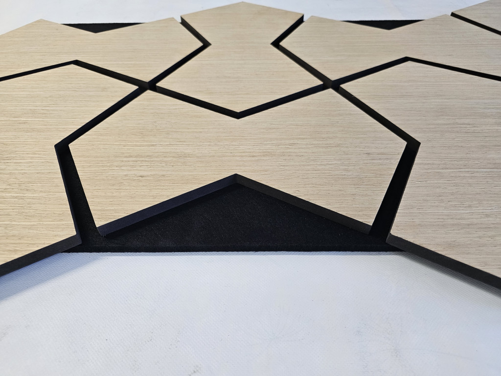 Anyag: MDF lamella valódi fa furnér bevonattal, poliészter (PET) akusztikai filc hátlappal